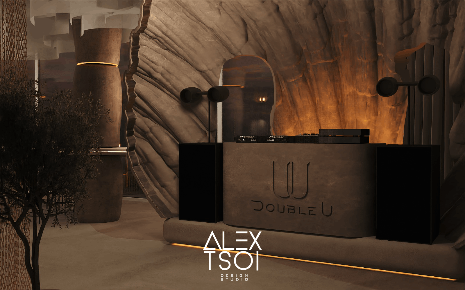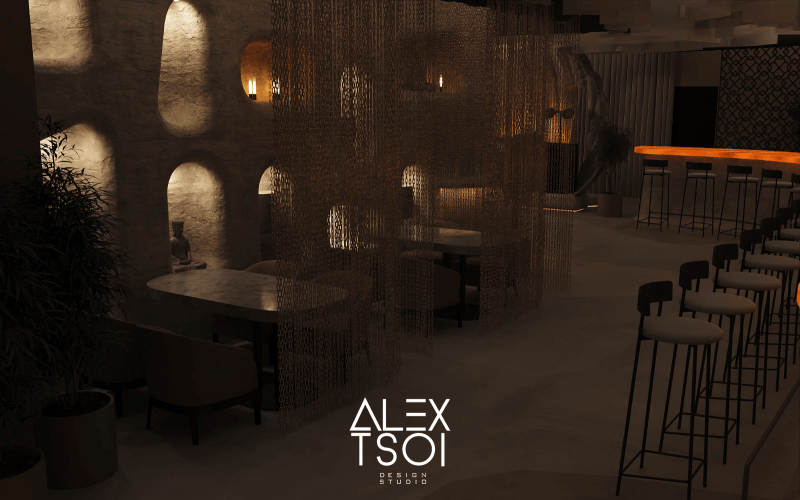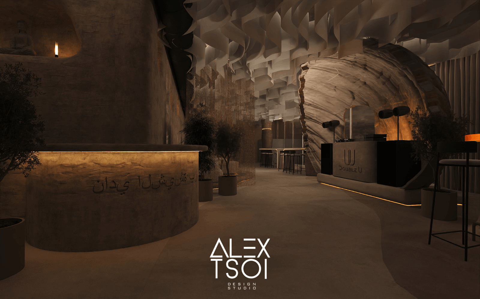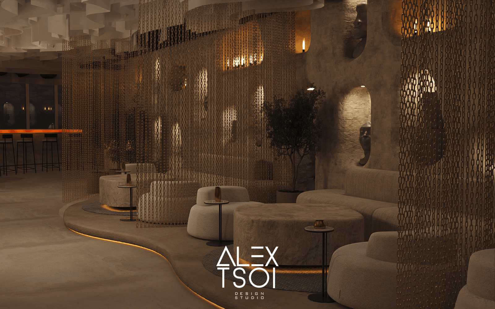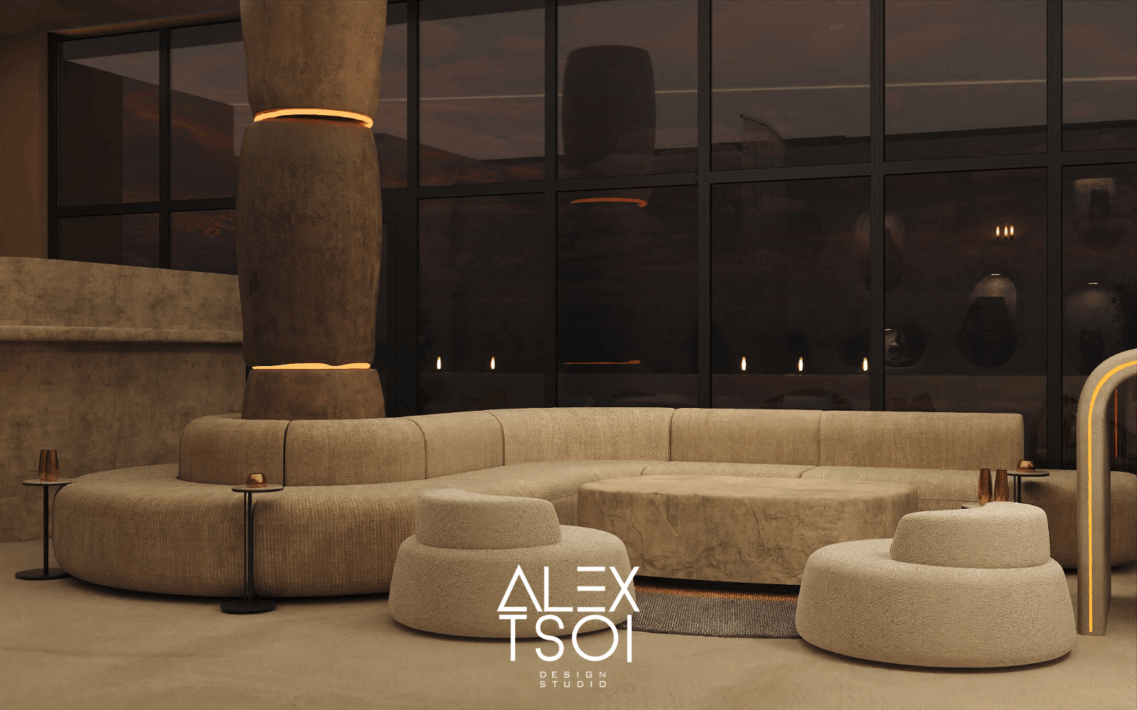Необычное, атмосферное пространство, стилизованное под современную «пещеру» с ярко выраженными отсылками к ближневосточной эстетике. В интерьере сочетаются органические формы, тёплая песочно-каменная палитра, а также фактурные поверхности, создающие эффект естественной породы. Всё это формирует обволакивающую, загадочную обстановку, идеально подходящую для ночного клуба с элементами лаунж-зоны и приватного отдыха.
