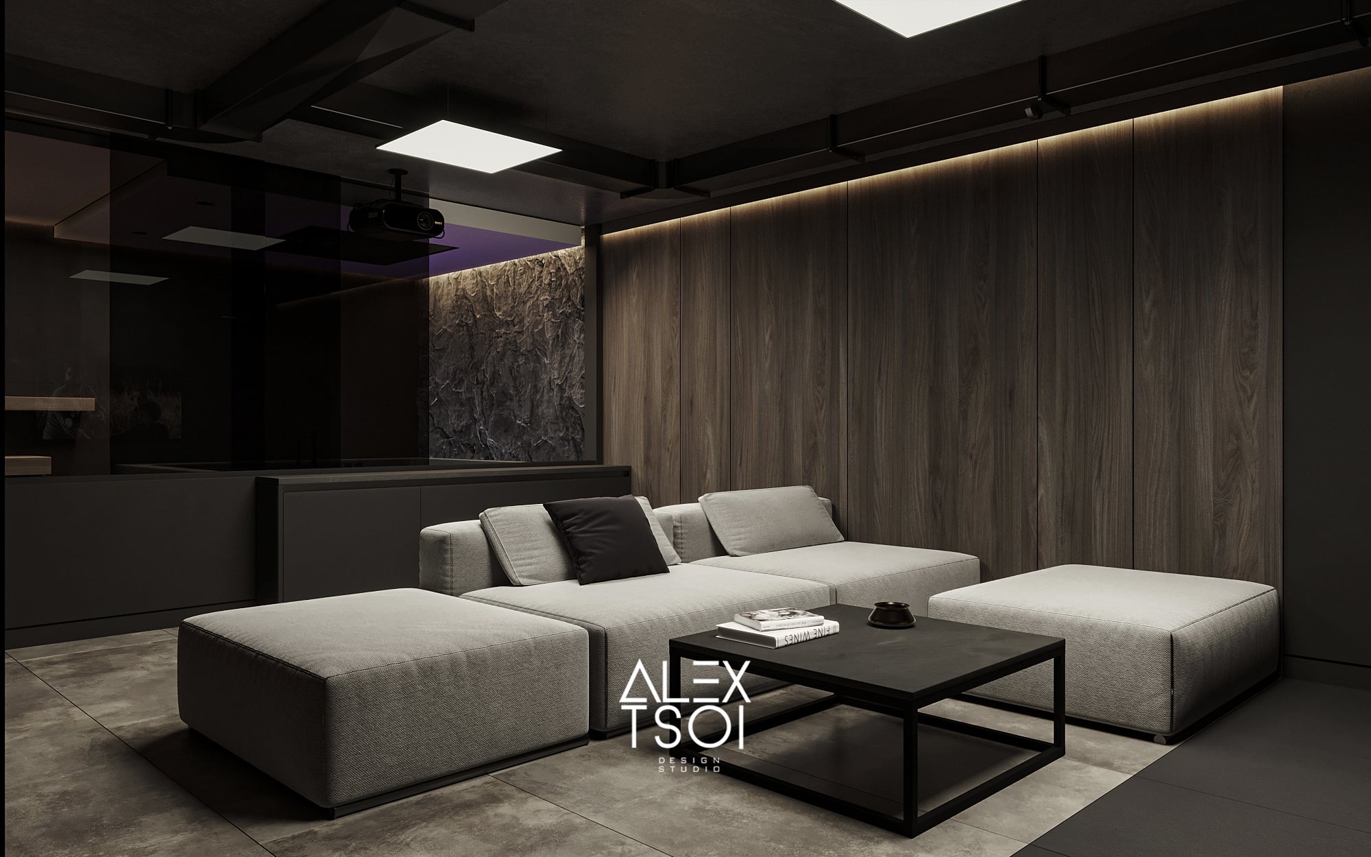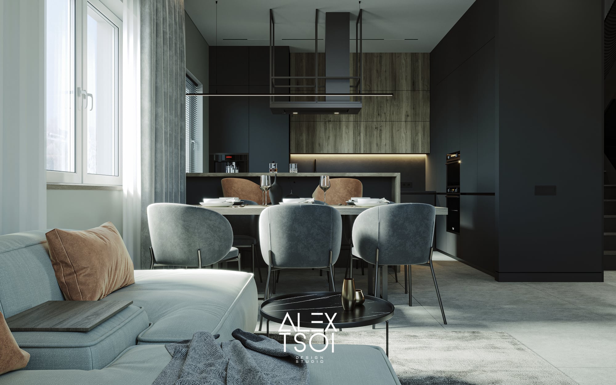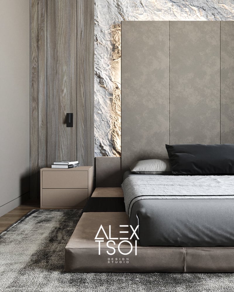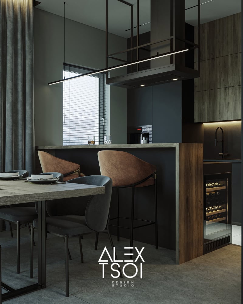 Интерьер квартиры выполнен в современном минималистичном стиле с заметным акцентом на натуральные фактуры и приглушённую, тёплую цветовую гамму. Однако в нём чувствуется и определённая «брутальность» — за счёт фактурных поверхностей, подчёркнутых мягкой подсветкой. Получается не просто классический «минимализм», а своего рода симбиоз современных решений, природных материалов и лёгких индустриальных ноток.