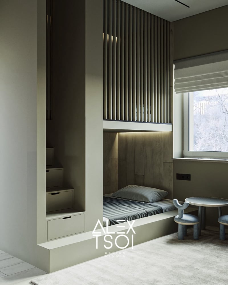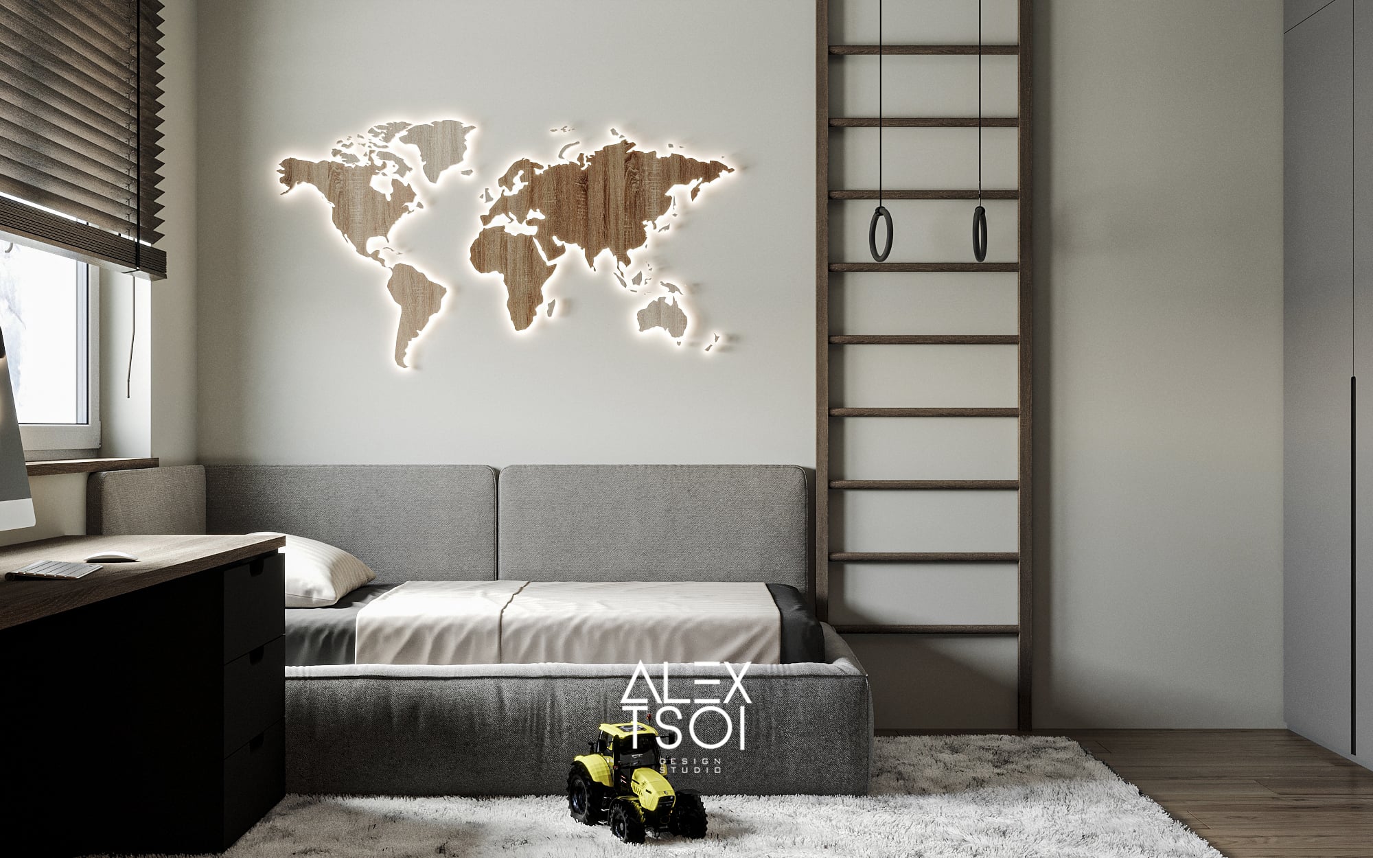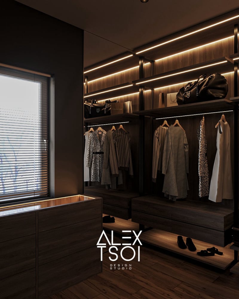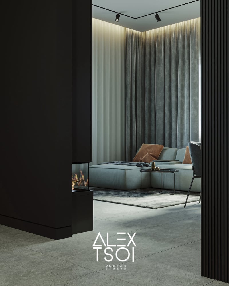 Интерьер квартиры выполнен в современном минималистичном стиле с заметным акцентом на натуральные фактуры и приглушённую, тёплую цветовую гамму. Однако в нём чувствуется и определённая «брутальность» — за счёт фактурных поверхностей, подчёркнутых мягкой подсветкой. Получается не просто классический «минимализм», а своего рода симбиоз современных решений, природных материалов и лёгких индустриальных ноток.