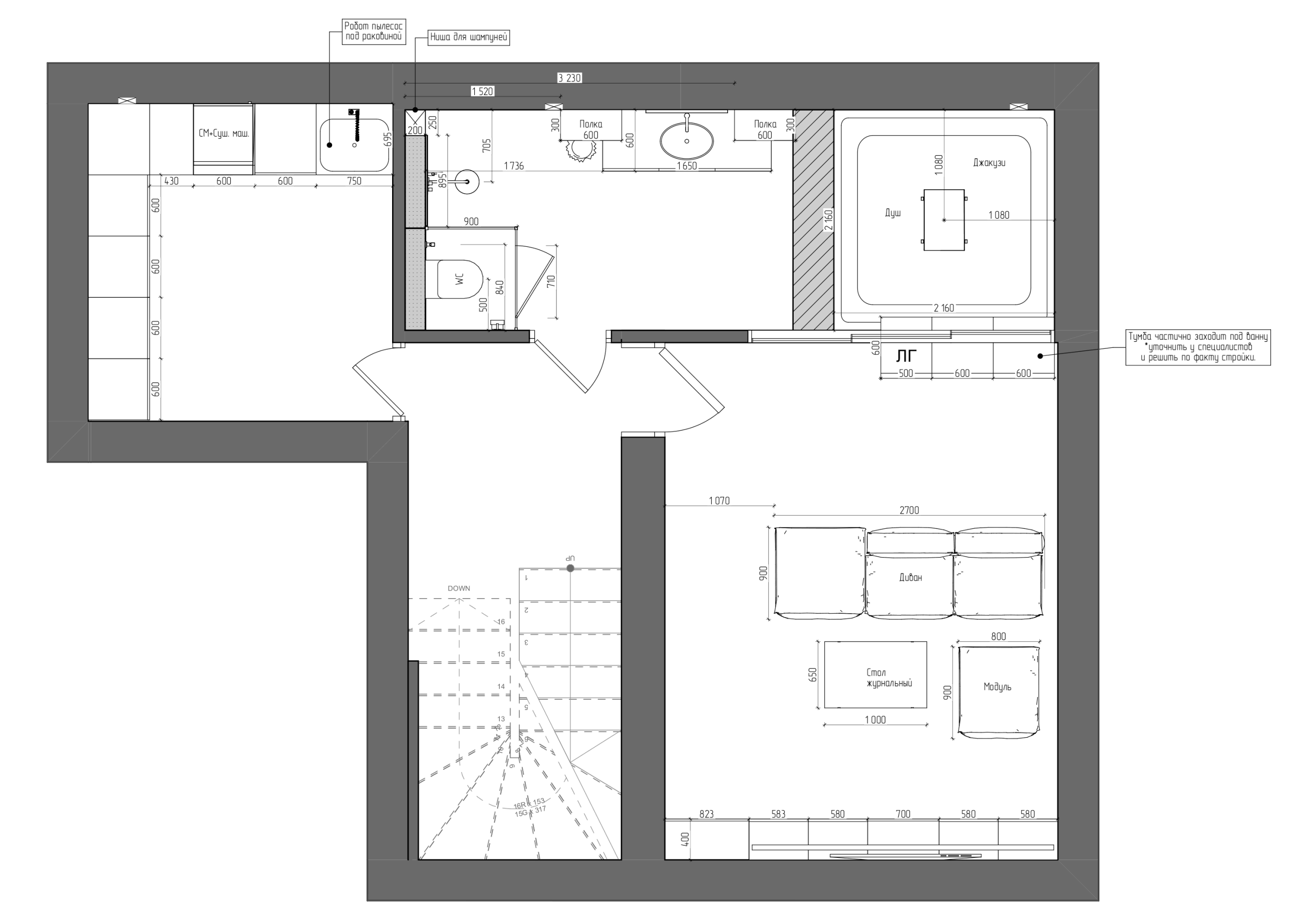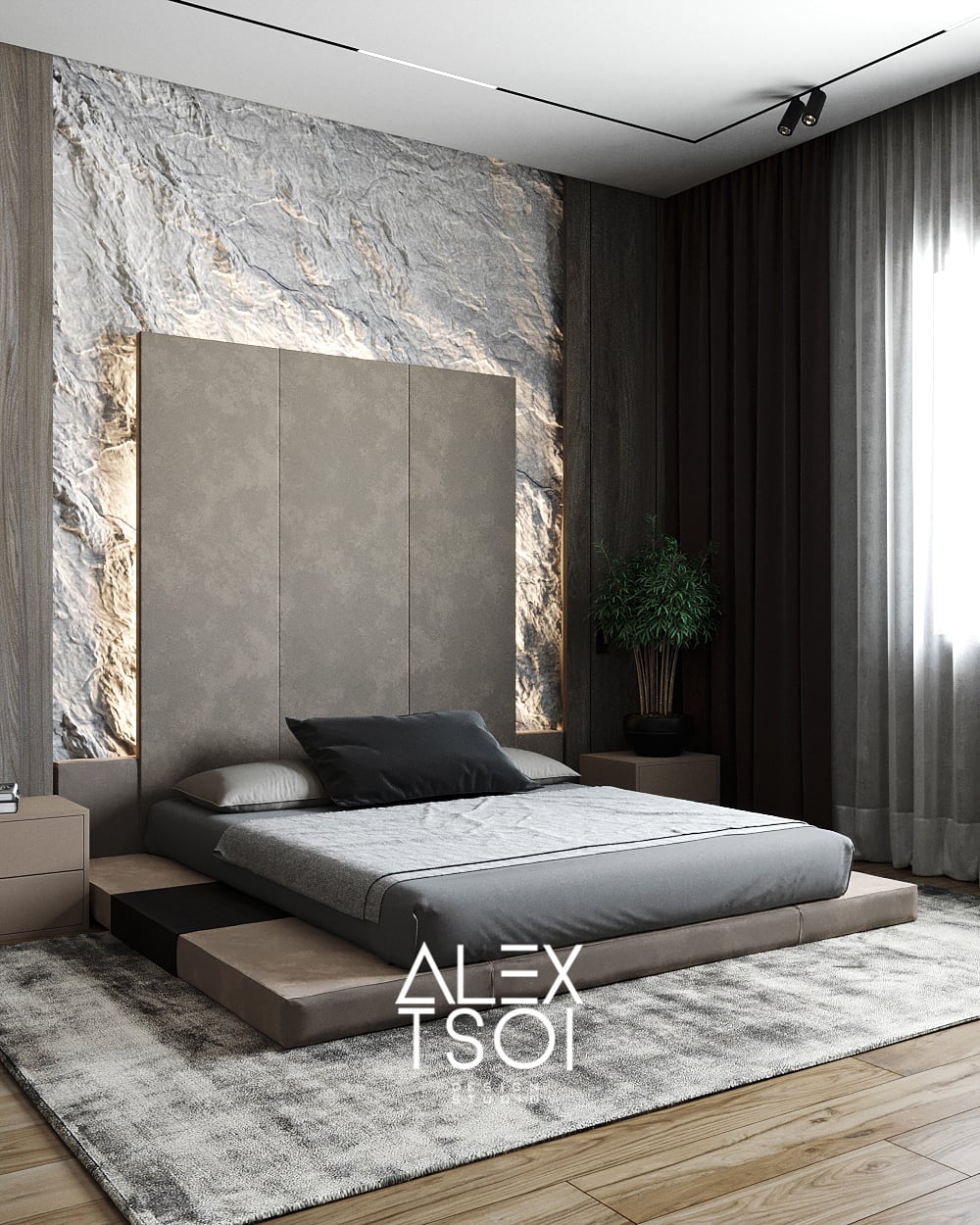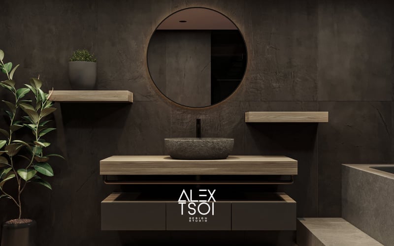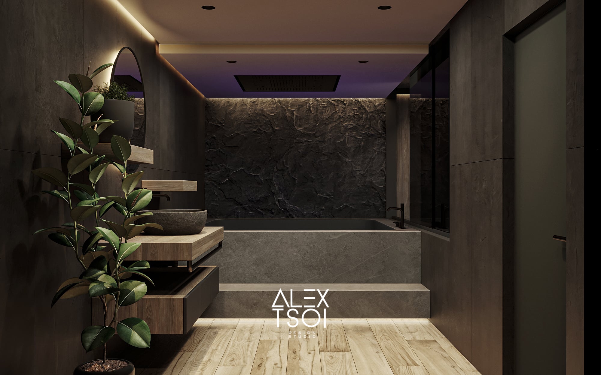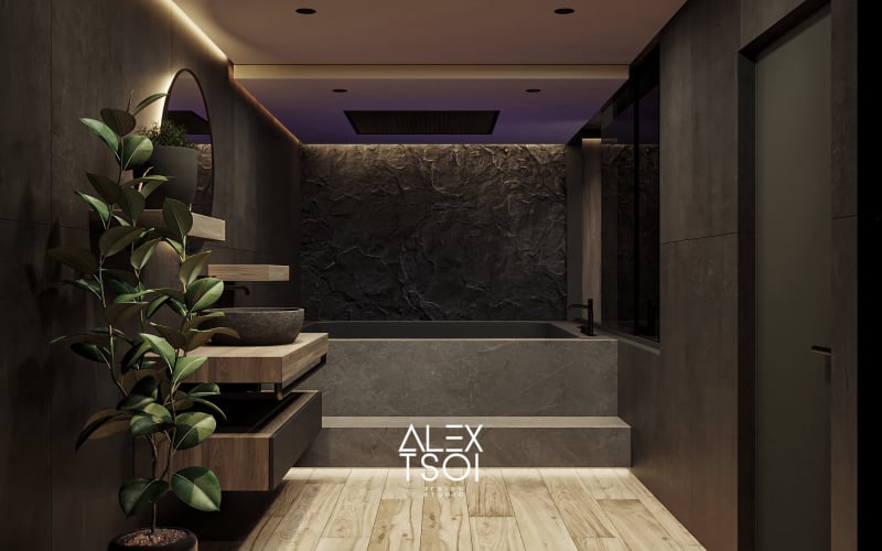 Минимум декоративных элементов: декор здесь скорее «функциональный» — чёткие геометрические формы мебели, интересные фактуры стен, аккуратно подобранные растения. Всё остальное сведено к лаконичным линиям и спокойным поверхностям. Ванная в особенно сильной степени напоминает «спа-зону» с каменными стенами и массивной чашей ванны.