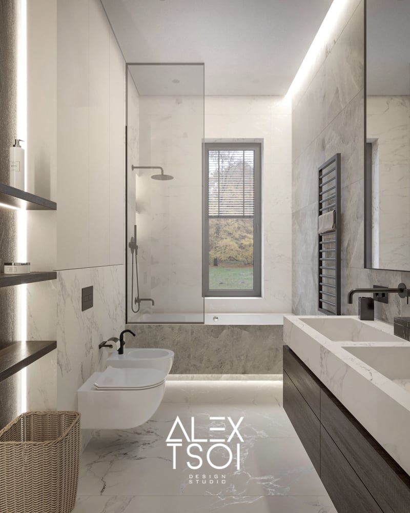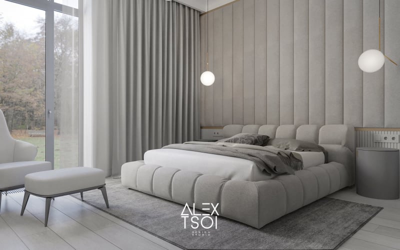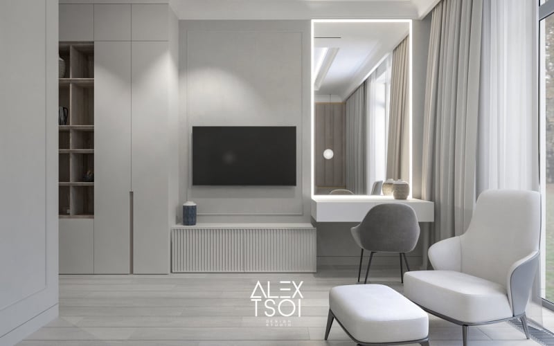 Отсутствие ярких цветовых акцентов — ставка сделана на нюансы фактур и игру полутонов. При этом интерьер не выглядит «стерильным» — он наполнен мягкостью и «объёмом. Элегантность и уют, стремление к балансу между функциональностью и визуальной привлекательностью.