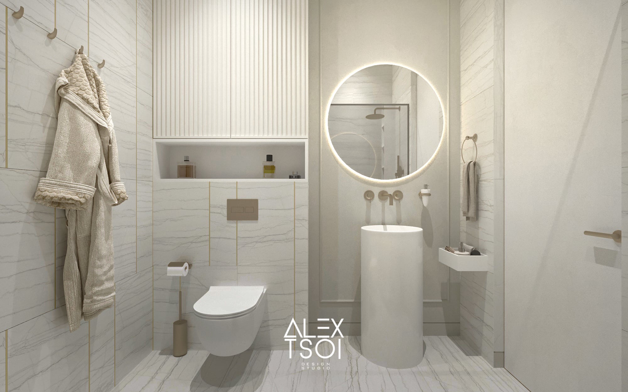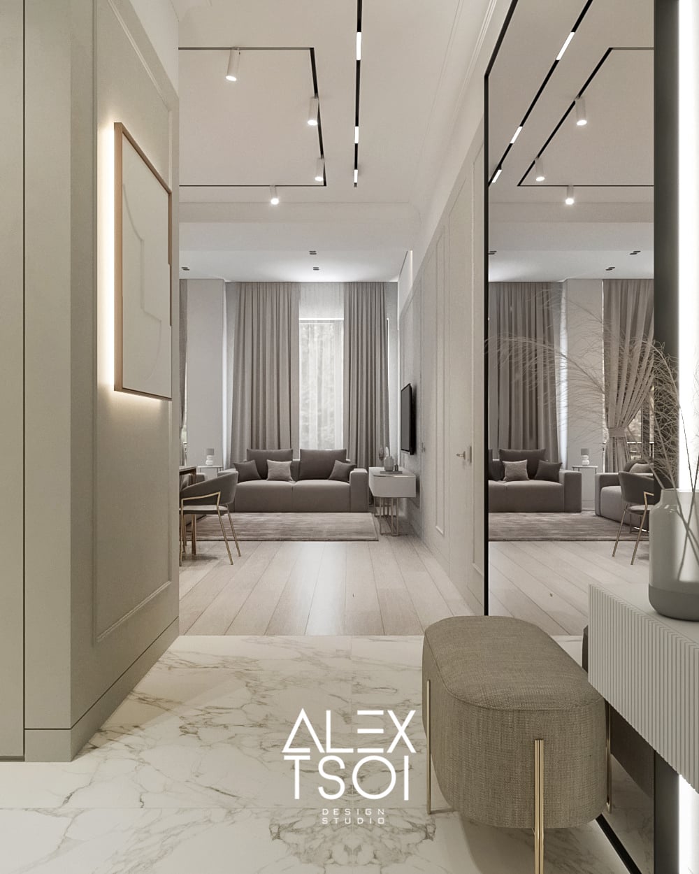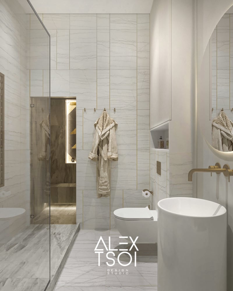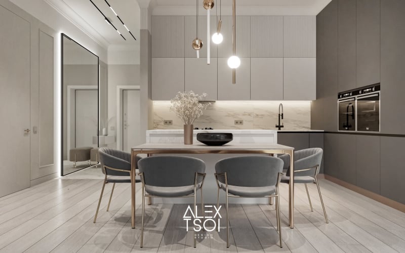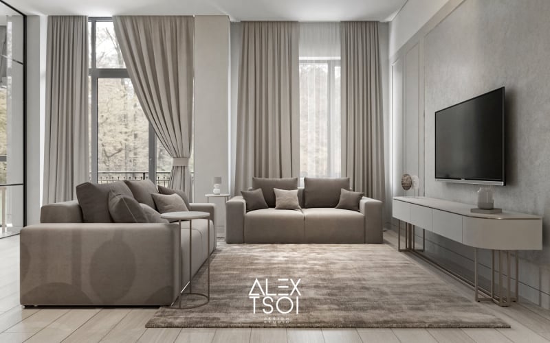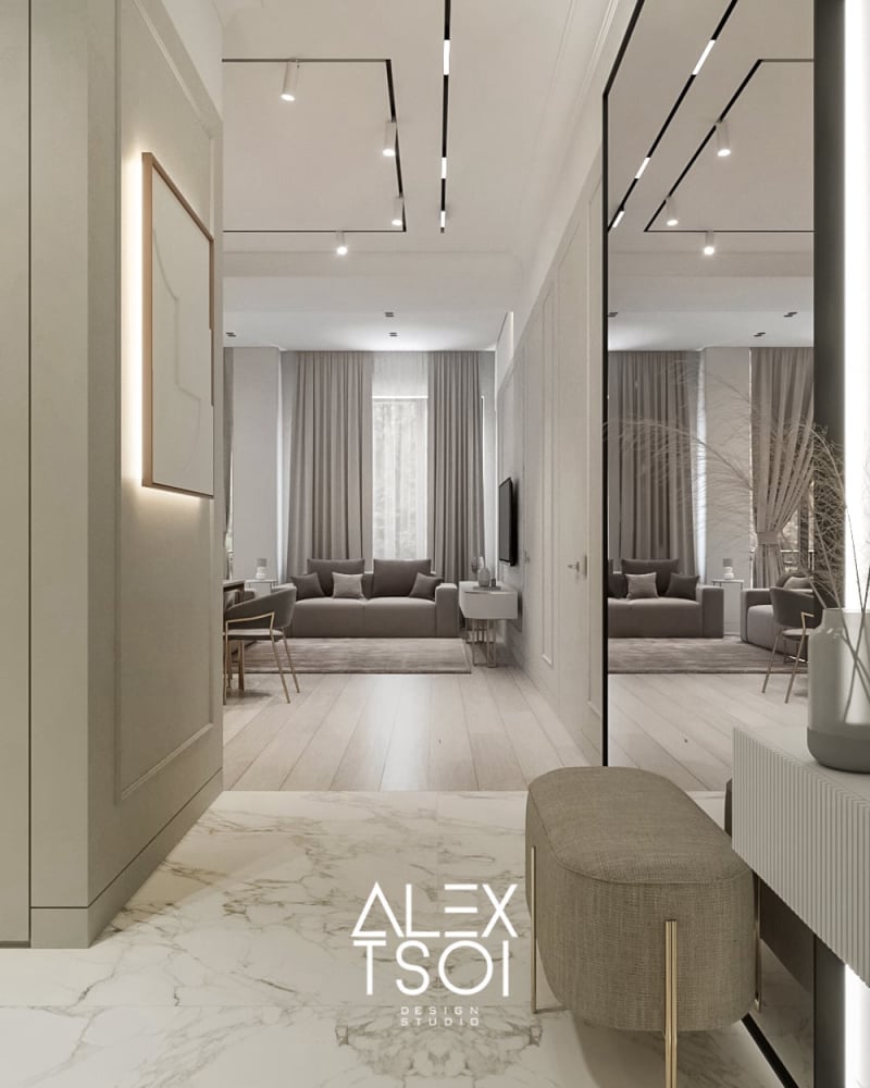Интерьер в стиле современного минимализма с характерными нотками «элегантной роскоши» — за счёт сочетания благородных материалов и общей нейтральной гаммы. Всё пространство наполнено мягким светом и выглядит светлым, воздушным, но при этом не холодным — благодаря тёплым бежево-серым оттенкам и тактильным фактурам.